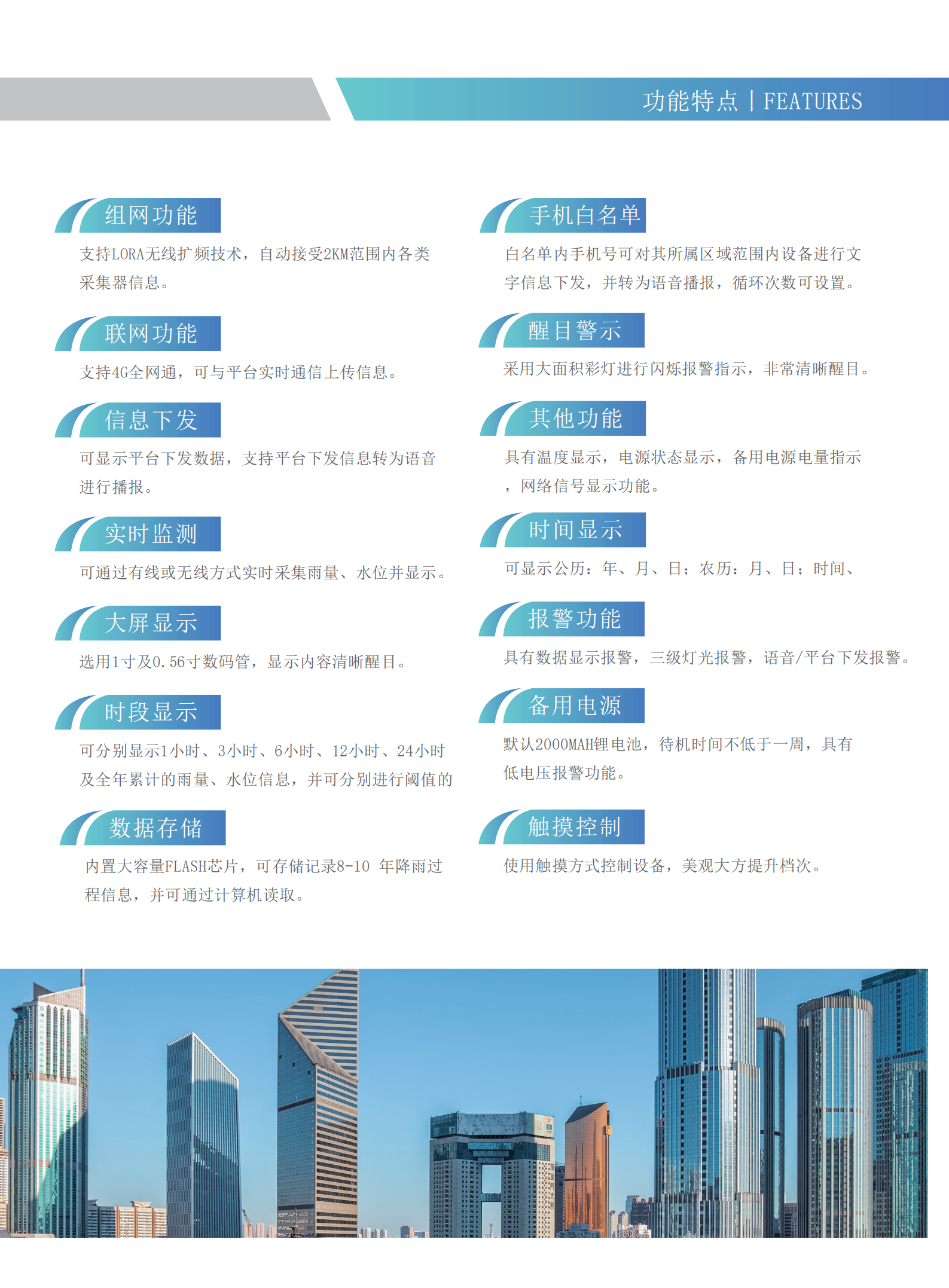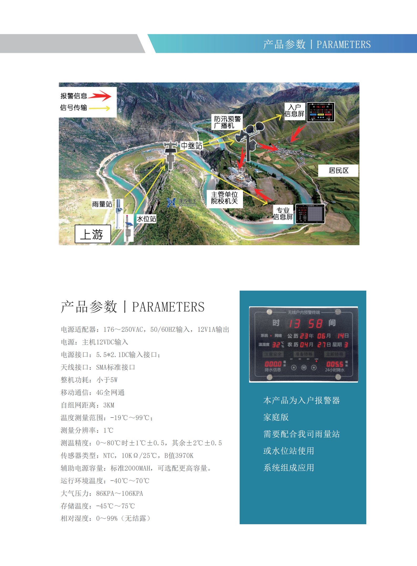 本产品是一款针对暴雨、山洪、泥石流等可能发生自然灾害的地区所研发的入户型报警器,具有外观美观大方,功能实用,免维护等优点。可以实时监测雨量及上游水位,并通过多种方式预警以保障下游居民人身及财产安全。